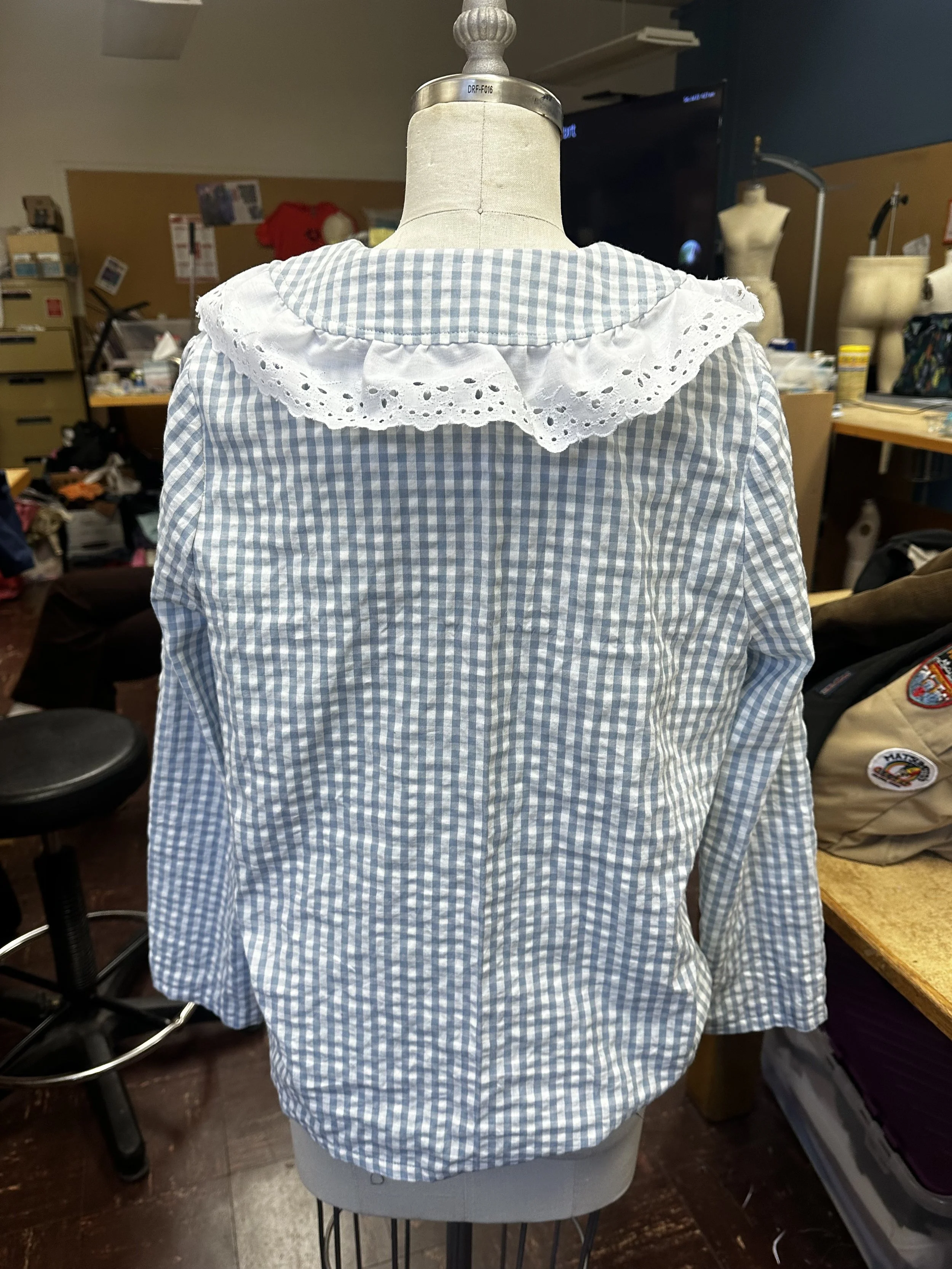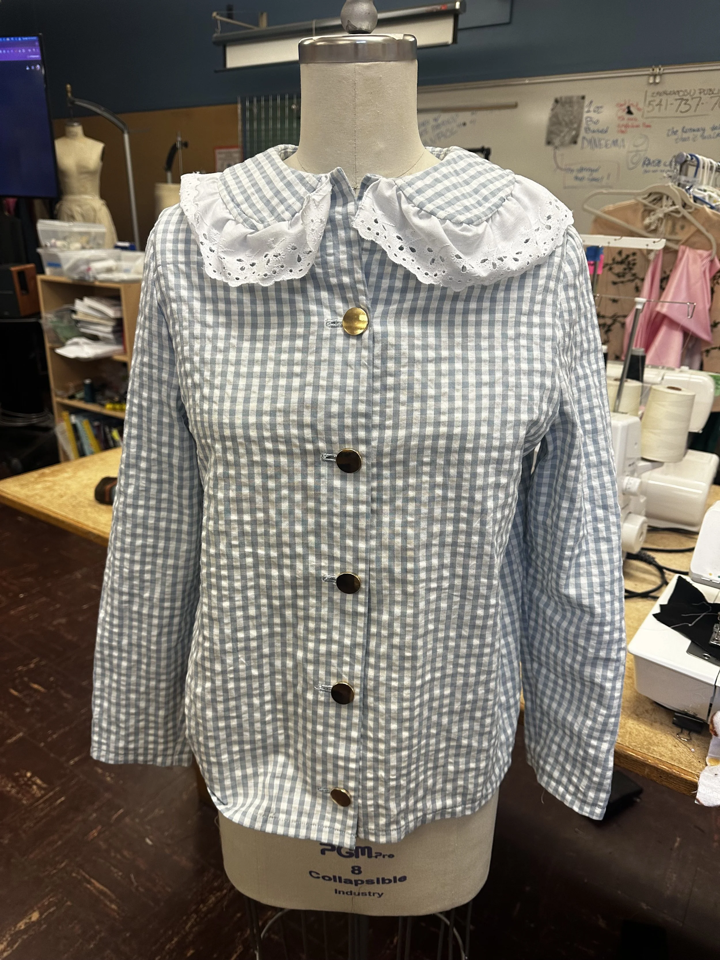 For this project, I developed my own full-scale unlined jacket prototype. I designed it based on my Research information board, selecting a fun Gingham woven fabric, gold buttons, and white trim. I constructed my jacket using a Patternmaking Book to create my jacket and Peter Pan collar pattern.